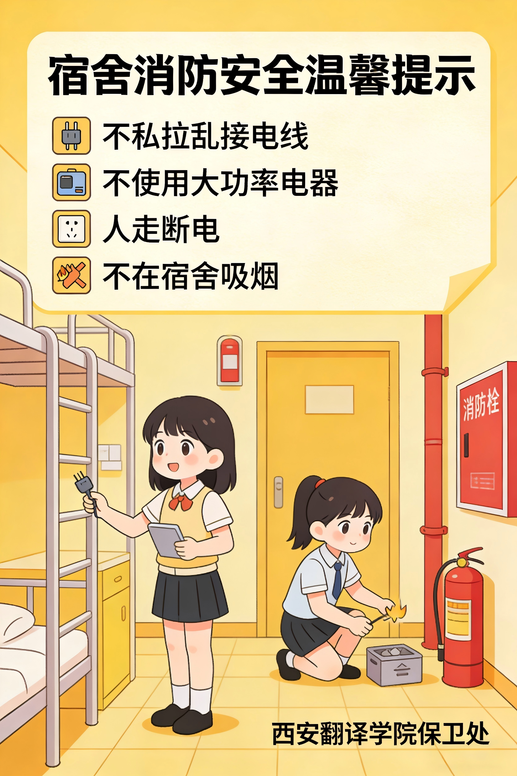 校园是梦想起航的地方,安全是实现美好愿景的基石。在宿舍内,严禁私拉乱接电线及使用违规电器;离开教室、宿舍时,务必切断电源和网络连接。在实验室中,必须严格遵守操作规程;在图书馆和楼道内,不得堵塞消防通道。增强安全意识,减少安全隐患,要始终将安全铭记于心,确保自身平安。祝愿全体学子平安前行,迈向光明未来。