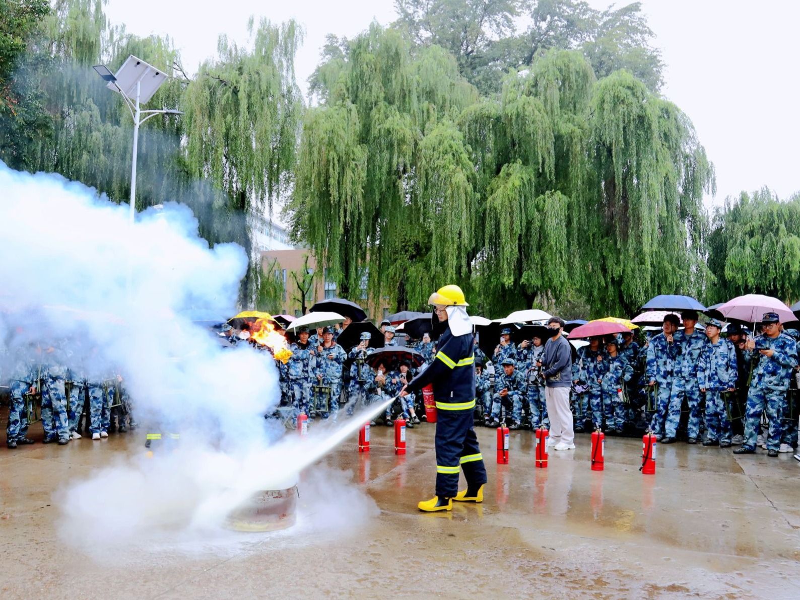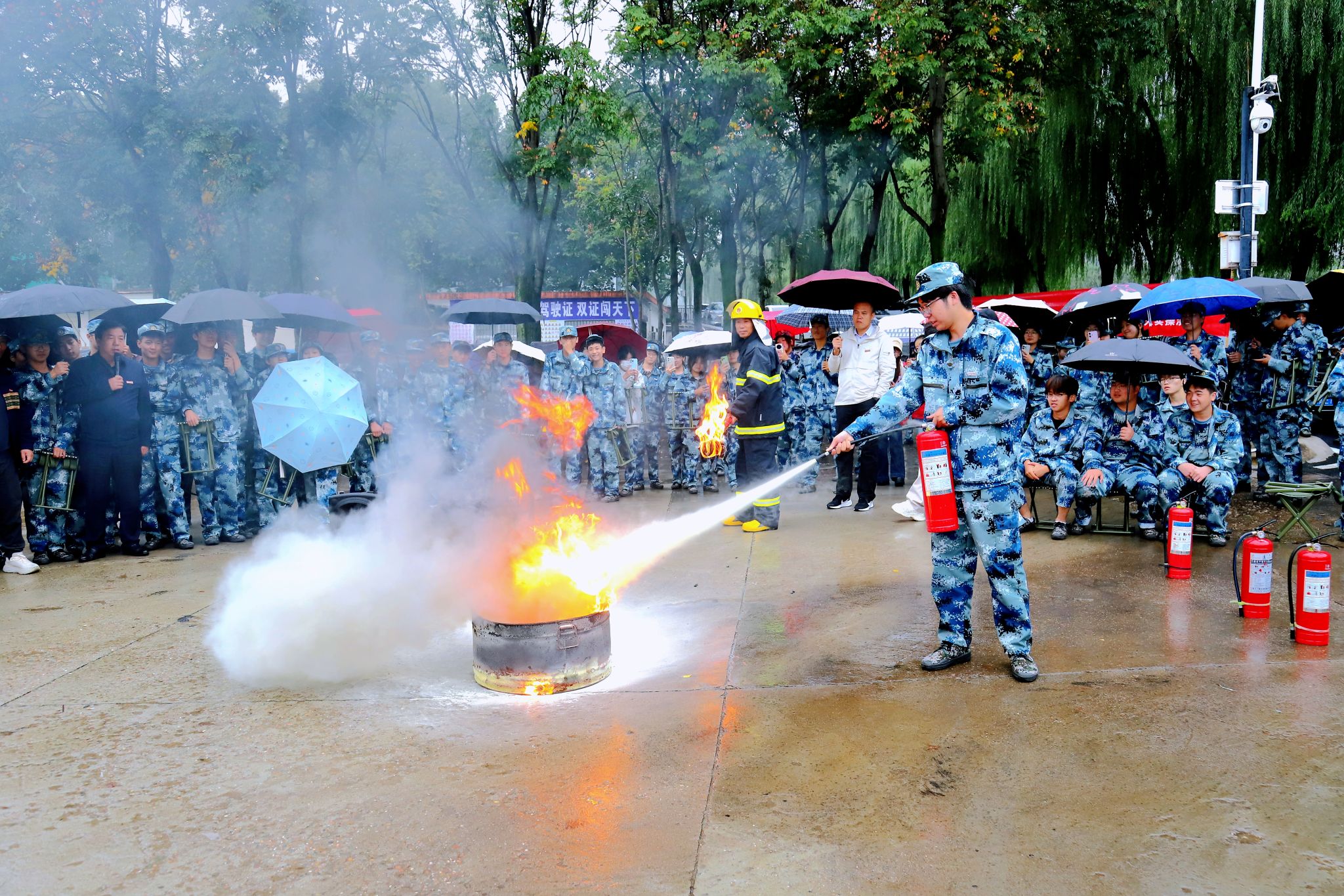 理论讲授结束后,最受新生期待的“实操环节”正式开始。在演练场地设置了模拟火点(使用安全油桶模拟初期火灾),配备30余具干粉灭火器及保卫处消防员现场指导。新生在辅导员和军训教官的引导下有序排队,依次上前体验“灭火实战”演练。